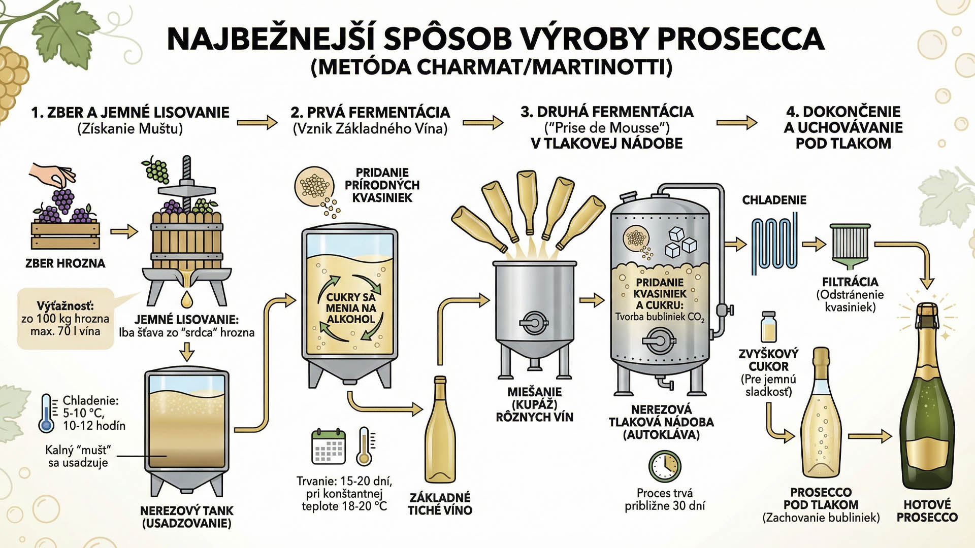Toto je najbežnejší spôsob výroby Prosecco. Po zbere sa hrozná prevezú do vinárstva, kde špeciálne navrhnuté stroje veľmi jemne stláčajú hrozno tak, že sa vylúči iba voľná šťava zo srdca hrozna (100 kilogramov hrozna by malo poskytnúť najviac 70 litrov vína). Táto zakalená šťava, známa ako „mušt“, sa potom nechá usadiť v nádrži z nehrdzavejúcej ocele, kde sa udržiava na chladnom 5-10 ° C počas asi 10 až 12 hodín.